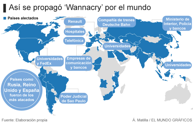 El virus infectó el sistema informático de Movistar y otras empresas españolas; el departamento de sanidad del gobierno de Reino Unido, la empresa automovilística Renault en Francia; el sistema de control ferroviario de Alemania, entidades financieras rusas y cientos y cientos de sistemas de gestión informatizados en empresas y organismos repartidos por todos el planeta.