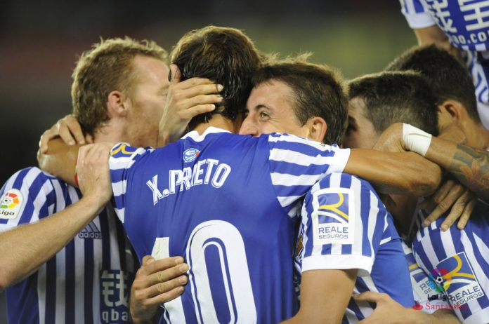 Se avecinaba una noche muy emocionante en Anoeta. Xabi Prieto iba a cumplir 500 partidos con la elástica de la Real Sociedad. Estaba previsto que la grada rompiera a aplaudir en el minuto 10 del partido en homenaje al capitán donostiarra. Y justo cuando los aficionados pararon de aplaudir, casi llegó el gol donostiarra de las manos de Juanmi, pero el disparo del malagueño fue desviado en frente de la portería.