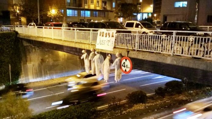 La Policía Municipal de Pamplona ha tenido que retirar cinco muñecos que colgaban, junto a una pancarta, del puente de Biurdana en Pamplona. La pancarta exhibía la foto de los cinco miembros del grupo ‘La Manada’, que están siendo juzgados en la capital navarra por la supuesta violación grupal de los Sanfermines.