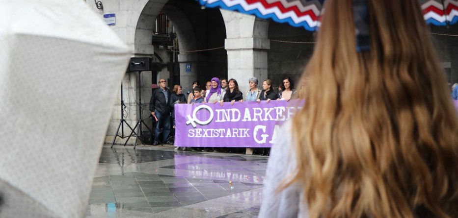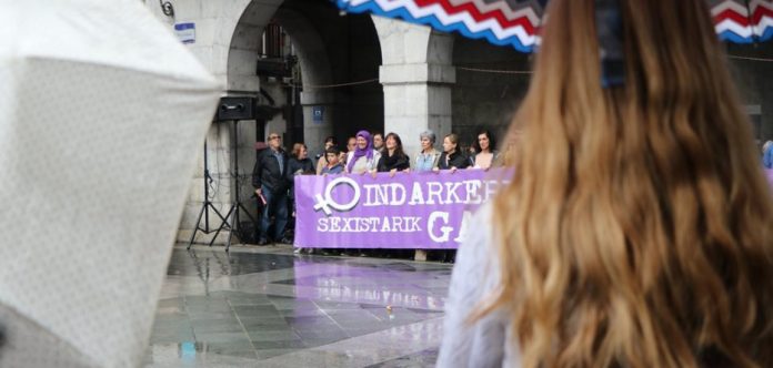 La protesta, convocada por los ayuntamientos de ambas villas junto a distintos movimientos feministas y grupos de mujeres de los dos municipios, comenzó pasadas las 19:00 horas en la Plaza Zaharra, donde se ha desplegó una pancarta con el lema en euskera “A favor de un pueblo sin agresiones sexistas”.