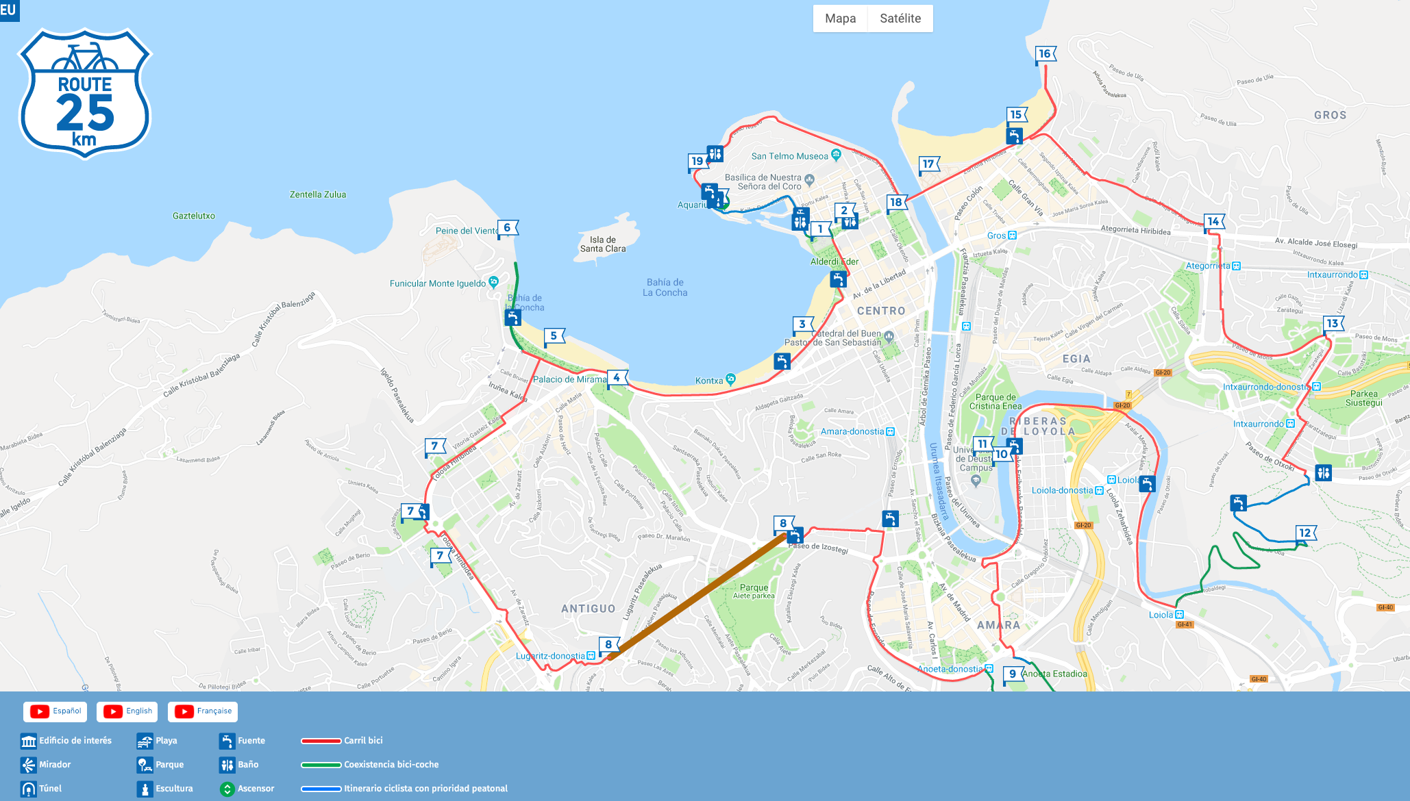 El mapa, que también puede consultarse en Internet, además de especificar la ruta, incluye la descripción de los lugares más emblemáticos de la ciudad por los que discurre el recorrido, como por ejemplo, el Kursaal, la playa de la Concha, el Peine del Viento, la Paloma de la Paz, el Paseo Nuevo, la ribera del río Urumea, Loiola o el parque de Ametzagaina.