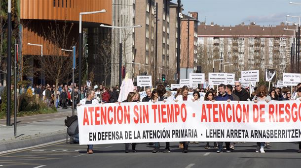Al término de la asamblea, más de 300 personas procedentes de los tres territorios de la CAV se han manifestado desde el Palacio Europa hasta la central de Osakidetza en una marcha bajo el lema Atención sin tiempo, atención de riesgo. En defensa de la Atención Primaria.
