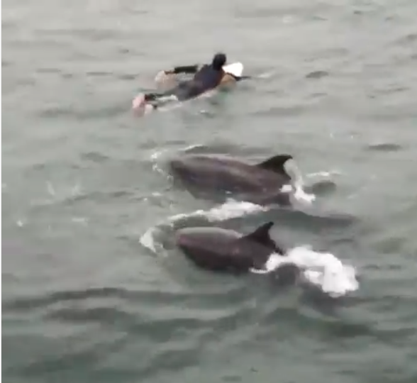 Un grupo de simpáticos delfines irrumpe en plena clase de surf en una playa de California. El fotógrafo Robin Fenlon grabó estas imágenes el pasado jueves y las subió a sus redes sociales.