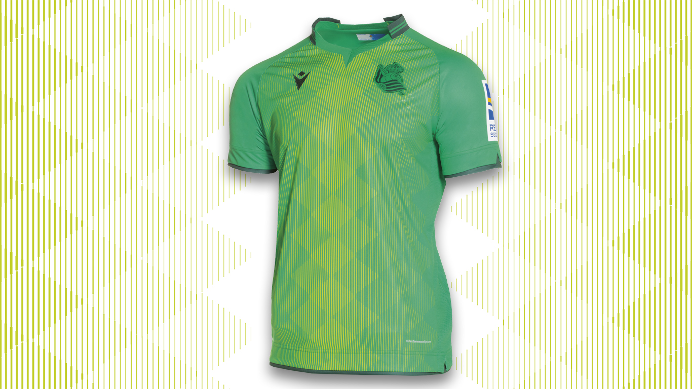 Sin embargo, el escudo no estará bordado, sino que combinará dos tonalidades de verdes. El logo de Macron se mantendrá en la parte derecha y como en la primera, esta segunda equipación tendrá por dentro el lema ‘ Bat, bi, hiru lau, bost, sei, zazpi…Real!‘. Las mangas y la cintura tendrán un final de tejido más oscuro que el resto de la elástica.