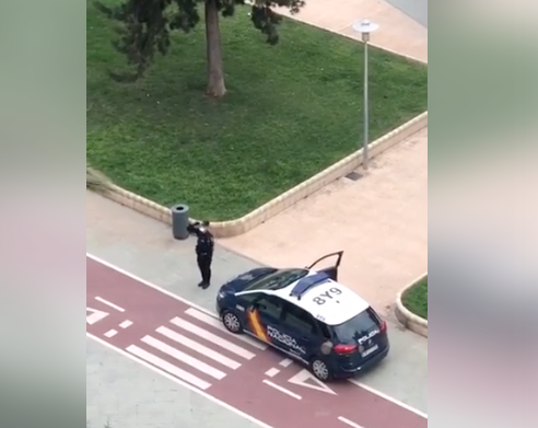 Un agente de la Policía Nacional dedica un baile a una casa de vecinos en Almería que permanecía en cuarentena debido al coronavirus.