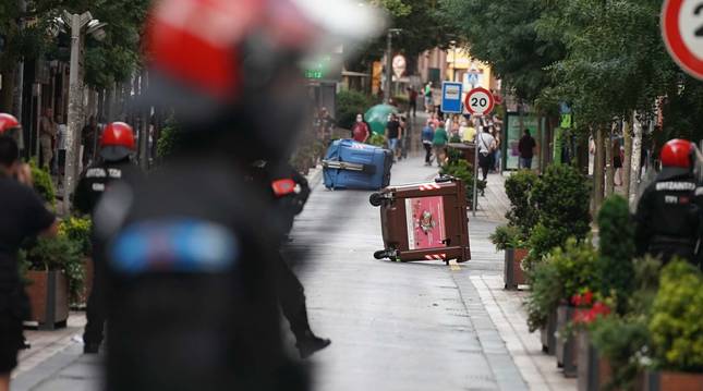 En el transcurso del acto, la Ertzaintza cargó contra los manifestantes, que arrojaron objetos contundentes y tornillería, y cruzaron y quemaron contenedores.