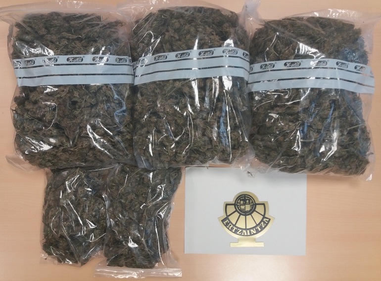 Los hechos ocurrieron por la tarde, en la carretera GI-2631, donde recursos de protección ciudadana de la Ertzaintza de Urola Kosta daban el alto a un turismo que previamente había realizado movimientos bruscos. Los agentes percibieron un fuerte olor a marihuana procedente del interior del vehículo y, en consecuencia, realizaron una inspección, siendo localizadas cinco bolsas de marihuana con un peso total de un kilo ochocientos, una escopeta de caza y diversa munición para el arma.