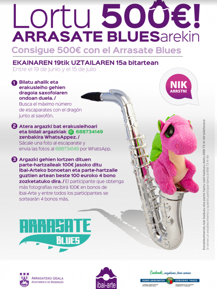 A partir del 19 de junio, en los escaparates de los comercios de Ibai-Arte encontraras los saxofones del Arrasate Blues colocados, pero en alguno de ellos, también puedes encontrar el dragón de la asociación. Fotografía los escaparates donde veas el saxofón y el dragón, que estén los dos, y envíalo al número de whatsapp 688734149. Pero cuidado, los dragones se irán moviendo de sitio, ¡no siempre estarán en los mismos escaparates! El  participante que envié más fotografías de diferentes escaparates recibirá 100 euros en bonos de compra de Ibai-Arte y se sortearán otros 4 premios de 100 euros entre todos los participantes.