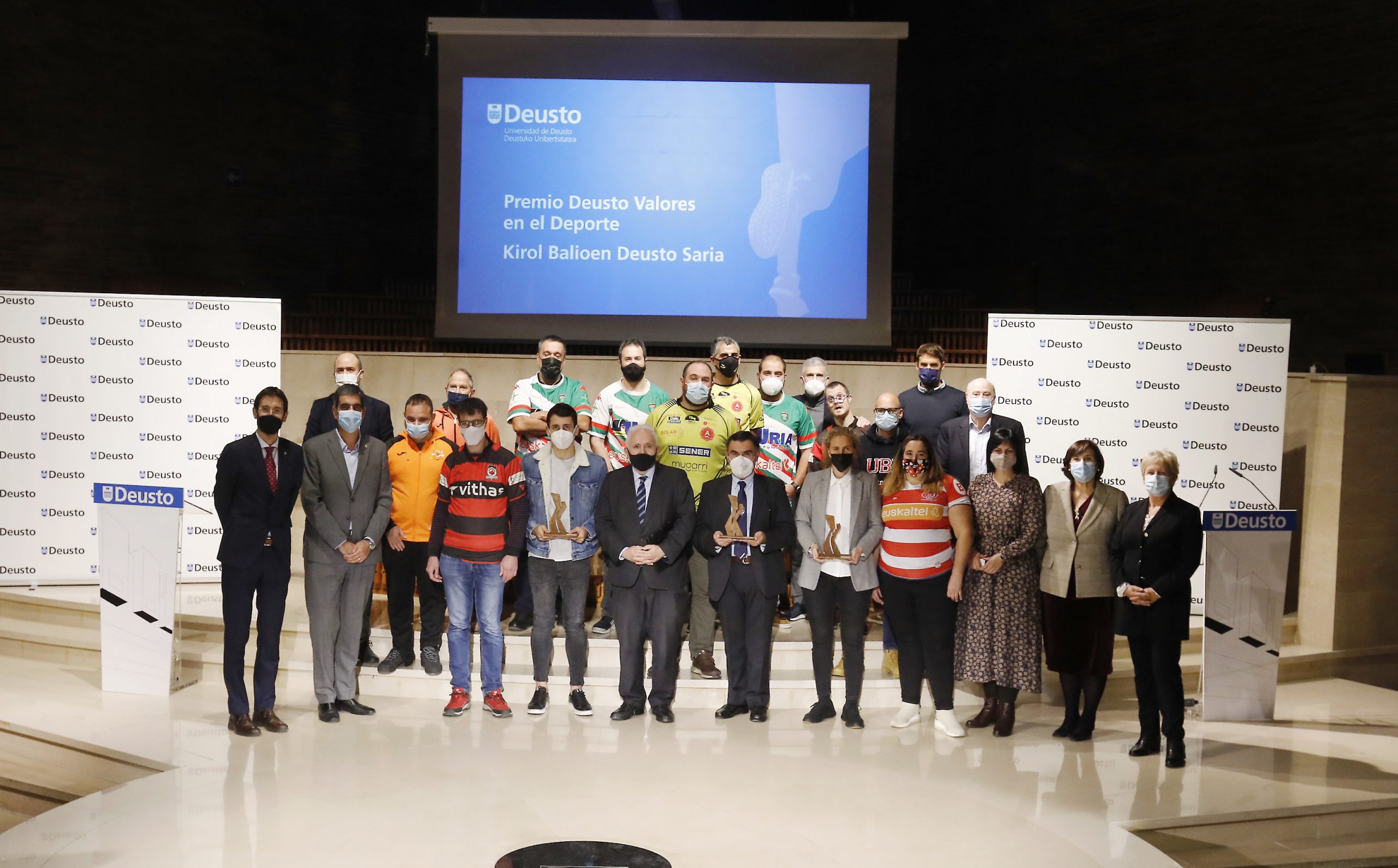 Ayer, jueves, tuvo lugar en el campus de San Sebastián de la Universidad de Deusto, el acto de entrega de la III edición del Premio Deusto Valores en el Deporte, iniciativa que busca premiar y reconocer públicamente a aquellas personas, entidades o iniciativas que se hayan significado especialmente en la defensa y promoción de valores humanos universales a través de la práctica deportiva. Los galardonados en esta edición del 2021 han sido los futbolistas Mariasun Quiñones (Athletic Club de Bilbao) y Mikel Oyarzabal (Real Sociedad), a los que se reconoce el valor del esfuerzo y la tenacidad ante el reto de desarrollar unos estudios universitarios desde su condición de deportistas de élite, y la Federación Vasca de Rugby, por su proyecto de rugby inclusivo.