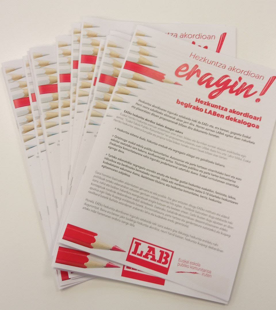 Ante el nuevo contexto que marca el acuerdo que alcanzaron la semana pasada los sindicatos y PNV, EH Bildu, Elkarrekin Podemos-IU y PSE-EE sobre las bases de la futura ley educativa, ELA, LAB, Steilas y CCOO han decidido desconvocar la huelga del 25 de marzo para analizar en profundidad los contenidos y compartirlos con el personal de Educación.