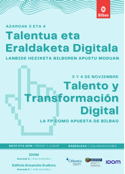 El Ayuntamiento de Bilbao organiza el 3 y 4 de noviembre las jornadas “Talento y Transformación digital: la FP como apuesta de Bilbao” con el doble objetivo de situar a Bilbao a la vanguardia en la transición digital y su capacidad para desarrollar iniciativas innovadoras y para dar a conocer a las empresas de servicios avanzados el potencial de la formación profesional en la creación de talento.