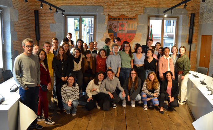 La intención era que el alumnado francés viajara seguidamente a Tolosa, pero la pandemia obligó a posponer la estancia prevista para 2020 y hoy 24 alumnas/os y 4 profesores procedentes de Charleville-Mézières han sido recibidos en el salón de Plenos por la alcaldesa, Olatz Peon Ormazabal y Xarles Iturbe, concejal responsable del departamento de Comercio, Turismo y Ferias.