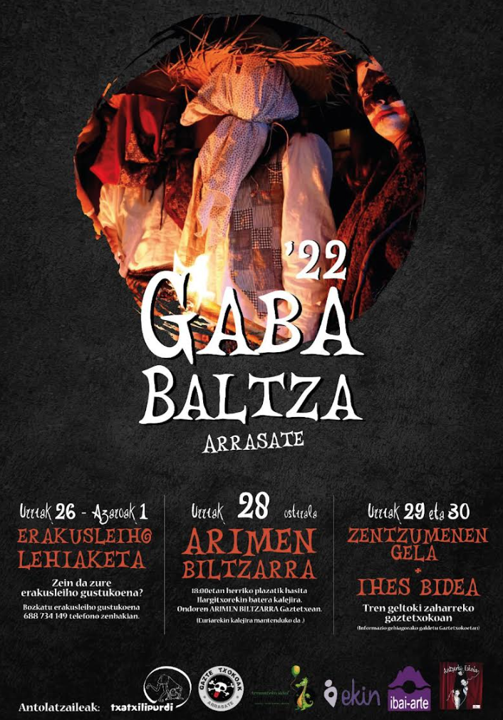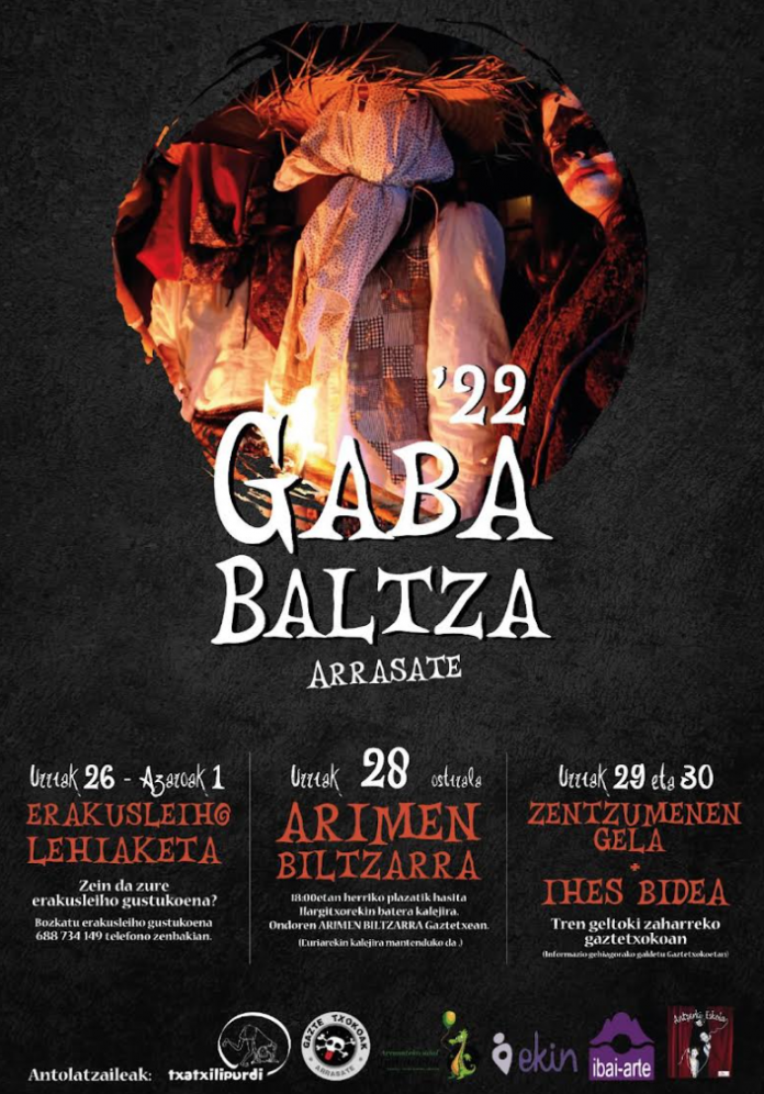 Conscientes de la importancia de organizar y vivir las fiestas desde el euskera y en euskera, desde la Asociación Txatxilipurdi, Ekin Emakumeak, las Ludotecas Municipales de Arrasate, Gaztetxokos, el grupo de teatro Doke e Ibai-Arte, queremos seguir impulsando la iniciativa de GABA BALTZA para seguir avanzando en su recuperación. Por ello, un año más, celebraremos la Noche de las Almas con motivo del Día de Todos los Santos, durante la última semana de octubre, con el objetivo de que niños, adolescentes y familias de la localidad disfruten juntos de una serie de actividades.