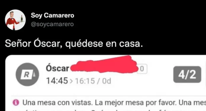 La cuenta de Twitter @soycamarero ha publicado esta solicitud, o exigencia, de un comensal al hacer una reserva junto a una contundente frase: “Señor Óscar, quédese en casa”.