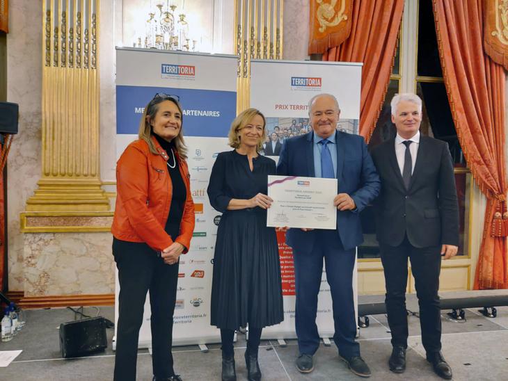La primera edición de los presupuestos transfronterizos ‘Ideiak 2022’ ha sido galardonada con el premio ‘Territoria de plata’ que otorga el Observatorio Nacional de Innovación Pública que impulsa el Senado francés. El certamen, que se celebra de forma anual, tiene como objetivo recompensar experiencias de buenas prácticas que se dan en el dominio de la acción pública local, como ha sido el caso de la iniciativa que es fruto de la colaboración entre la Diputación Foral de Gipuzkoa y el departamento de Pirineos Atlánticos. La entrega del premio se celebró ayer en Paris, en un acto celebrado en la Asamblea Nacional, y al que acudió una delegación formada por la diputada foral de Gobernanza, Eider Mendoza; el presidente de los Pirineos Atlánticos, Jean-Jacques Lasserre; el responsable de Acción Exterior de la institución foral, Ander Arzelus; y el consejero departamental de los Pirineos Atlánticos Joseba Erremundeguy.
