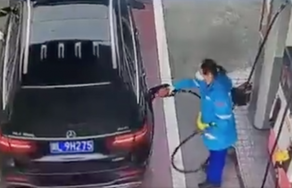 La operaria echa gasolina al vehículo mientras el conductor y los acompañantes permanecen en el interior. Cuando la trabajadora termina, cierra el depósito y se dirige a una de las ventanillas para cobrar. El escándalo llega en ese momento, ya que desde el coche le arrojan sin más los billetes, que caen al suelo. La trabajadora mira enfadada a los ocupantes del vehículo y finalmente tiene que agacharse para recoger el dinero mientras el automóvil arranca y se va.