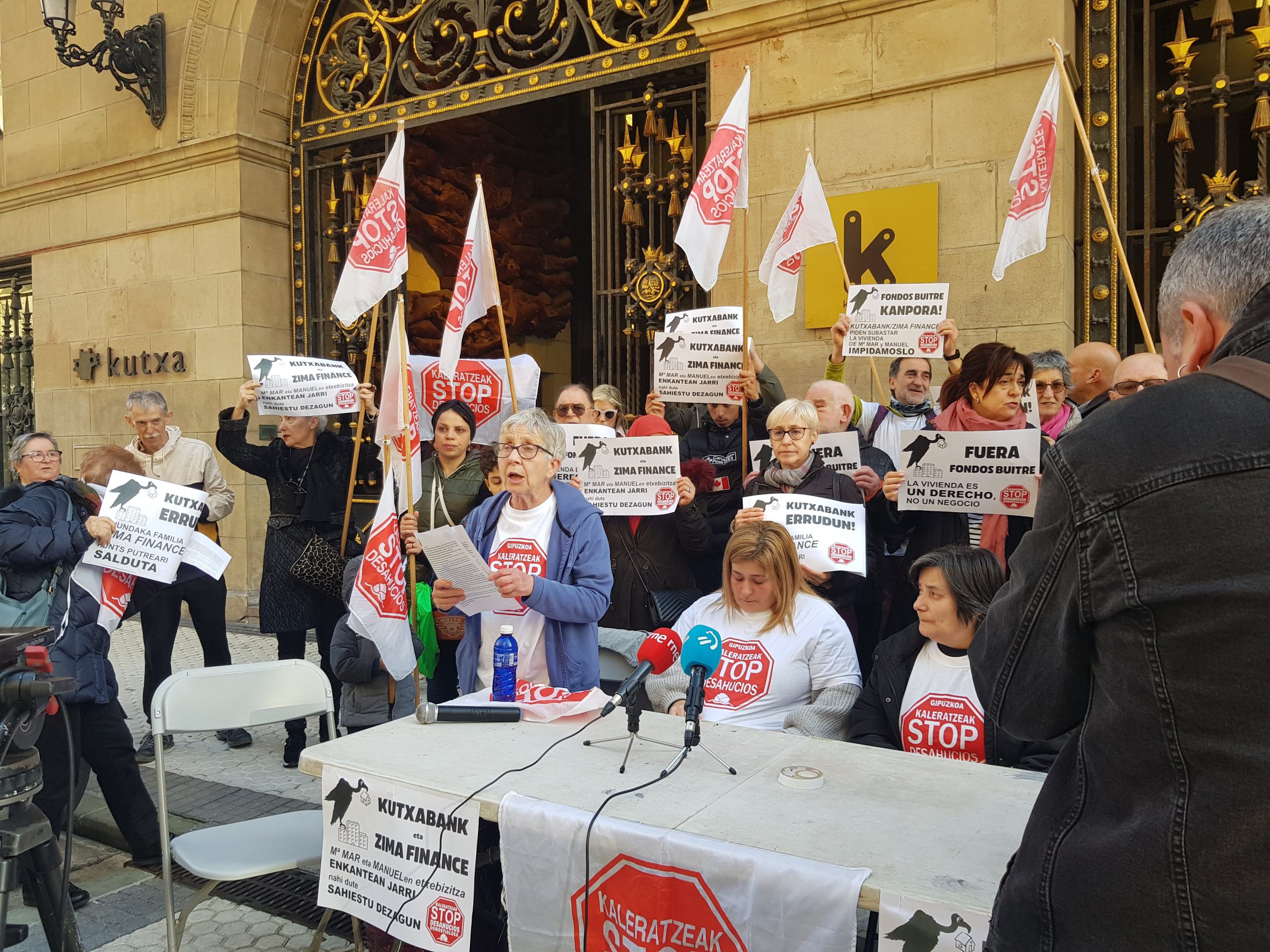 Ayer, miercoles, Stop Desahucios llevo a cabo una concentración en la capital guipuzcoana para paralizar la subasta de la vivienda de toda la vida de Mari Mar y Manuel, un matrimonio de pensionistas del barrio de Altza que avaló el préstamo hipotecario con el que su hija compró un local para instalar un comercio. Finalmente dicho negocio no prosperó y ahora el fondo de inversión al que Kutxabank vendió la hipoteca ha solicitado la subasta del piso de los avalistas.