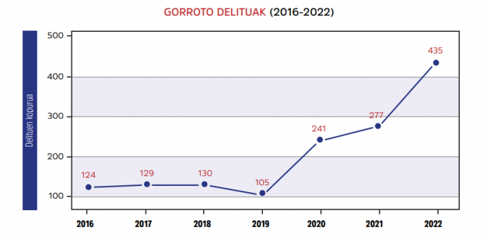 Txostenak Ertzaintzak 2022an erregistratutako 438 gorroto-gertakari aztertzen ditu, horietako gehienak, 435 (% 99,3), gorroto-delituak dira, eta 3 (% 0,68) gorroto izaerako arau-hauste administratiboak. Aztertu diren 435 delituetatik 9tan diskriminazio anizkoitzak erregistratu ziren; hori dela eta, kolektibo babestuen aurkako delituak guztira 444 izan ziren, eta kopuru hori 2022an erregistratutako gorroto-delituen kopurua baino handiagoa da.