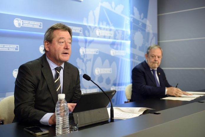 Bingen Zupiria Eusko Jaurlaritzako bozeramaile eta Kultura eta Hizkuntza Politiketako sailburuak agerraldia egin du Gobernu Kontseiluaren bileraren osteko prentsaurrekoan, Pedro Azpiazu Ekonomia eta Ogasuneko sailburuarekin batera.