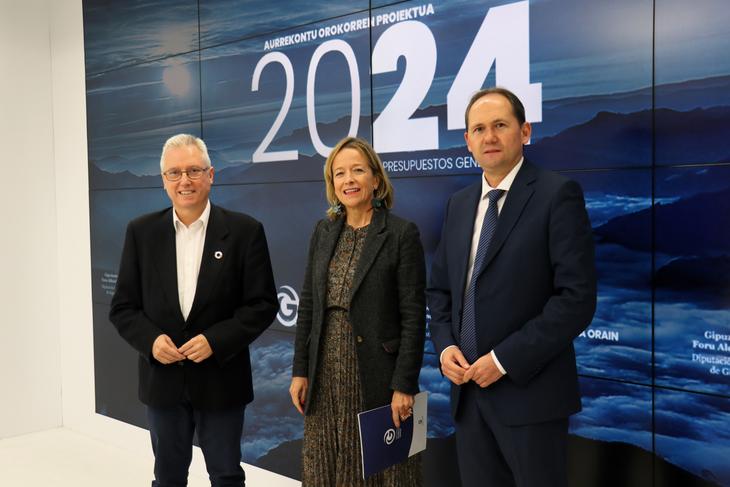 La diputada general ha presentado los presupuestos de 2024 en una rueda de prensa celebrada esta mañana, en la que también han participado el teniente de diputado general, José Ignacio Asensio, y el diputado foral de Hacienda y Finanzas, Jokin Perona. La propuesta ha recibido hoy el plácet del Consejo de Gobierno y será entregada este mediodía al presidente de las Juntas Generales de Gipuzkoa, Xabier Ezeizabarrena, Se abre así el plazo para debatir las cuentas en la Cámara, primero en comisión, luego a través de enmiendas y finalmente en sesión plenaria.