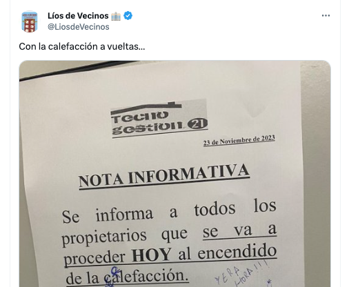 El encendido de la calefacción de la comunidad suele ser una buena noticia, sobre todo cuando comienza a hacer más frío. Como podemos ver en la imagen, en un vecindario, tras ser notificados, varios vecinos han respondido a la nota. Uno muestra su alegría con un «yera hora!!!», mientras que otro, afirma lo siguiente: «nunca se me arrio tanto la muyer». La captura ya es viral.