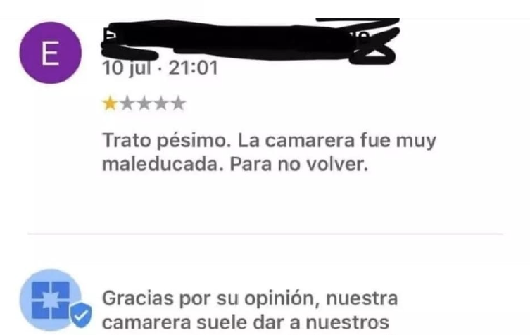 Las reseñas que un cliente puede publicar en internet tras visitar un establecimiento en ocasiones crean bastante polémica. El ejemplo que recogemos hoy muestra cómo el propietario responde a un usuario que dice haber recibido un «trato pésimo» «La camarera fue muy maleducada», añade, «para no volver». Ante tales palabras, el dueño del local le explica que su camarera «suele dar el trato recibido por ellos y siempre consigue que vuelvan los clientes que nos interesan». Un zasca que ha sido muy aplaudido en redes.