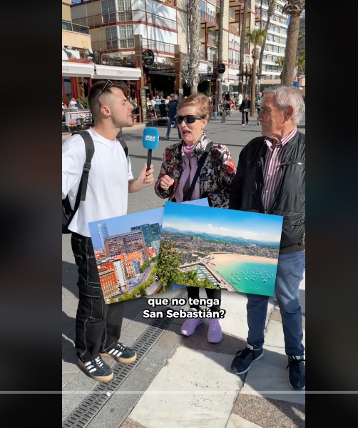 El conocido tiktoker guipuzcoano, Iban García, ha publicado este vídeo grabando en Benidorm, donde se encuentra con una pareja de Bilbao. Al ser todos de Euskadi, comienzan a hablar sobre Donostia y la capital vizcaína. «Bilbao es Bilbao», presumen los entrevistados, a lo que Iban García les pregunta: «¿Qué es lo que tiene Bilbao que no tenga San Sebastián?». La respuesta, ya es viral: «La ría», responde la mujer y su pareja va todavía más allá, afirmando que «Donostia es un barrio de Bilbao».