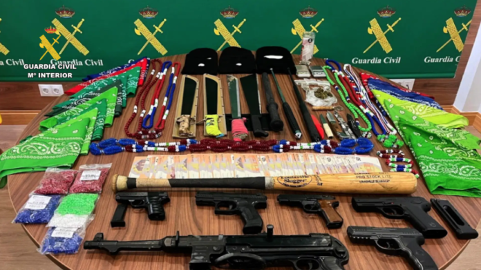 En los diversos registros realizados, los agentes han encontrado diversas armas como un subfusil de asalto simulado, cinco pistolas simuladas, cuatro bolos machetes, diversas navajas, defensas extensibles y bates de madera. Asimismo, se han incautado sustancias estupefacientes, dinero simulado, dispositivos electrónicos y gran cantidad de prendas características de la organización.