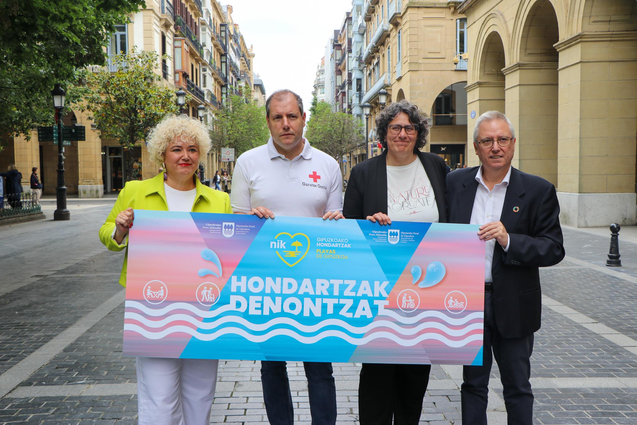 La diputada foral de Cuidados y Políticas Sociales, Maite Peña, el diputado foral de Sostenibilidad, Jose Ignacio Asensio, el vicepresidente de Cruz Roja en Gipuzkoa, Felix Zubia, y la directora técnica de la Federación Guipuzcoana de Deporte Adaptado, Alicia Figueroa, han presentado esta mañana una nueva y ampliada edición del programa de baño adaptado y asistido de verano destinado a las personas de todas las edades con discapacidad, movilidad reducida y dependencia de Gipuzkoa, ‘Hondartzak denontzat’. Se trata de un renovado servicio que ya se ofertaba desde hace más de ocho años en la playa Malkorbe de Getaria, y que este año, tras una inversión total cercana a 200.000 euros, y con un renovado convenio con la Cruz Roja, quiere llegar a todas las personas con dependencia y discapacidad de Gipuzkoa.