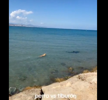 Un tiburón ha aparecido junto a la orilla de la playa de Les Deveses de Denia y un perro que se encontraba en la zona se ha lanzado al mar a perseguirlo. Al principio el escualo toma ventaja, pero llega un momento en el que el animal doméstico casi le alcanza. Afortunadamente, el can desiste y vuelve a la orilla.