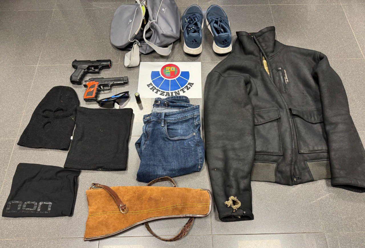 Agentes de la investigación, con la pertinente autorización judicial, realizaron una entrada y registro en el domicilio de la persona detenida. Allí se hallaron varias prendas y complementos que se correspondían con la vestimenta empleada en uno de los robos, así como un arma corta simulada con la que pudo perpetrar uno de los atracos en Arrasate-Mondragón.
