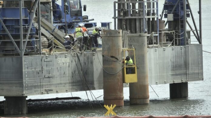 Para la instalación de estos pilotes, que comenzó en el mes de junio, se están empleando medios marítimos singulares, que no son de empleo habitual, incluyendo una pontona (una embarcación con cuatro ‘patas’ que se apoyan en el lecho fluvial) y embarcaciones sobre las que se sitúan otros elementos, como grúas, pilotadoras o bombas de impulsión, así como otros elementos auxiliares para el traslado de materiales. Los pilotes sobresalen sobre la lámina de agua para permitir su ejecución y hormigonado y, posteriormente, se les recortará la parte superior para colocar sobre ellos los encepados, unos elementos que los unirán y sobre los que se alzarán las pilas que finalmente soportarán el tablero de la estructura metálica del puente y los acabados del mismo.