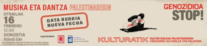 “Musika eta Dantza Palestinarekin” ekitaldi solidarioa, hasiera batean urtarrilaren 25erako programatua, atzeratu egin behar izan zen eguraldi txarraren ondorioz. Hala ere, ezusteko horrek gure asmoak indartzeko balio izan du, eta hitzordu hori are handiago eta ozenago bihurtzeko. Orain, indar eta konpromiso handiagoz, otsailaren 16an 12:00etan Alderdi Ederren, palestinar herriaren alde gure ahotsa altxatzeko bilduko gara.