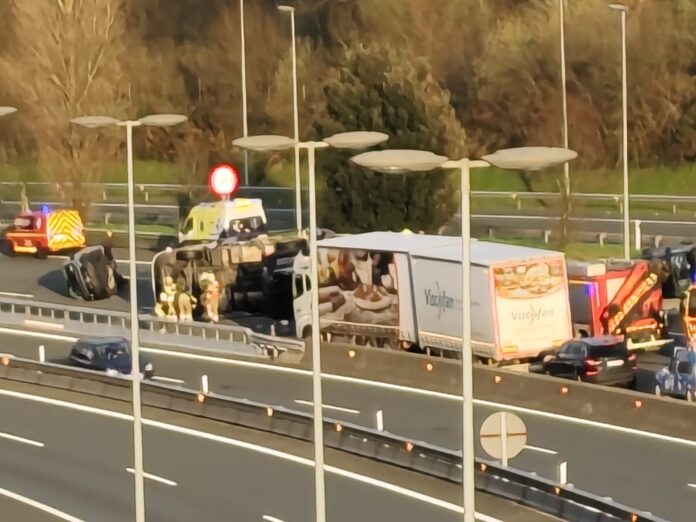 En el siniestro el camión perdió varios de los coches que portaba, que quedaron cruzados en la calzada, obligando a cerrar dos carriles de la autopista.