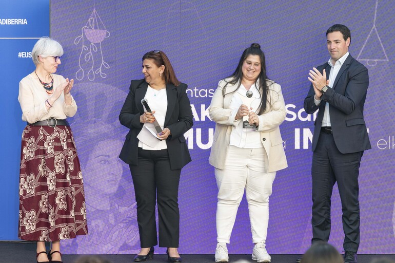 El lehendakari Imanol Pradales ha sido el encargado de entregar el Premio Emakunde a la Igualdad a las asociaciones IMME, Asociación para la integración de las mujeres musulmanas, y AMUGE, Asociación para la promoción y el empoderamiento de las mujeres gitanas, «por visibilizar y atender las múltiples formas de discriminación que viven tanto las mujeres gitanas como las mujeres musulmanas». El galardón ha sido recogido por Tamara Clavería, integrante de AMUGE; y Djamila Zereib, integrante de IMME.