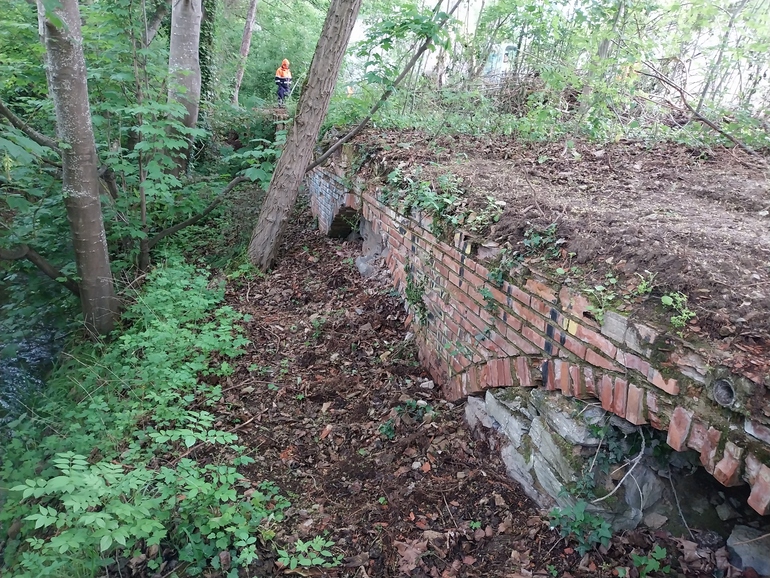 Este elemento de piedra se ha conservado para poder recolocarlo en la zona. Concretamente se han conservado los arcos realizados en ladrillo de una antigua fábrica situada en el entorno. Por el contrario, se han demolido los muros que existían sobre esos mismos arcos y que fueron superpuestos. URA se ha encargado de llevar a cabo la demolición de eso muretes y de la recogida de los restos de escombros existentes en el entorno. El Ayuntamiento de Vitoria-Gasteiz, por su parte, ha realizado la gestión del propio escombro, así como la limpieza de los residuos sólidos urbanos localizados en la zona.