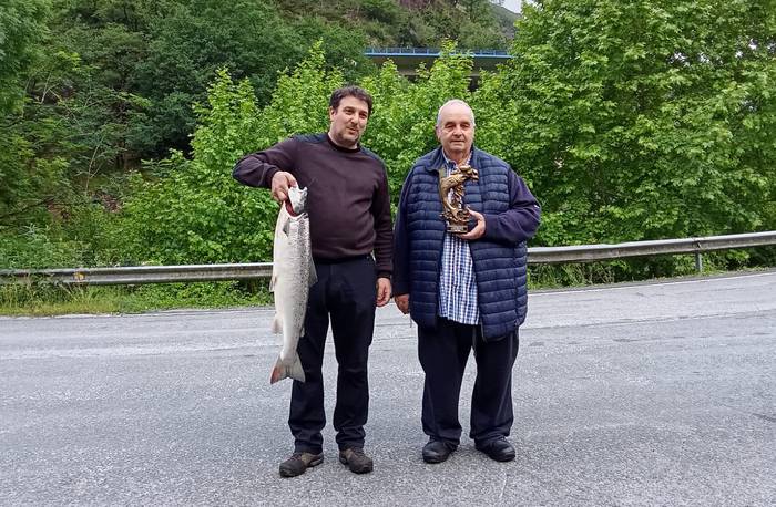 El primer salmón que se pesca en el río Bidasoa cada temporada, denominado «Lehenbiziko», ha sido capturado esta mañana, sobre las 7:40 horas, por el pamplonés David Miranda Elizalde. El ejemplar pesa unos 5 kilos y ha sido vendido por 1800 euros al restaurante Rekondo de Igeldo.