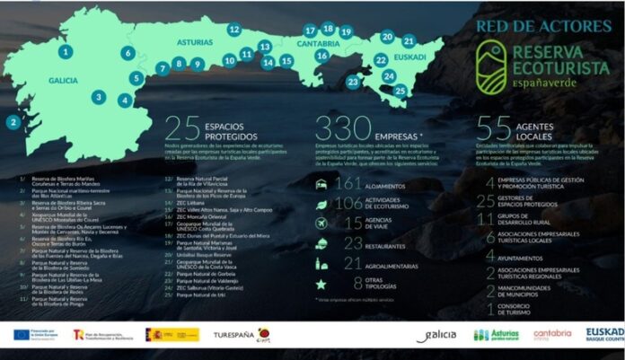 Este proyecto de gobernanza público-privada ha puesto a trabajar de manera coordinada a casi cuatrocientos agentes de diversa naturaleza: 330 pymes turísticas en el medio rural, 55 agentes locales (gestores de espacios protegidos, ayuntamientos, asociaciones, grupos de acción local), además de cinco Administraciones públicas (cuatro Comunidades Autónomas y Turespaña). El resultado ha sido un catálogo de 118 experiencias ecoturísticas que ya se pueden reservar a través de la web https://ingreenspain.es/reserva-ecoturista/