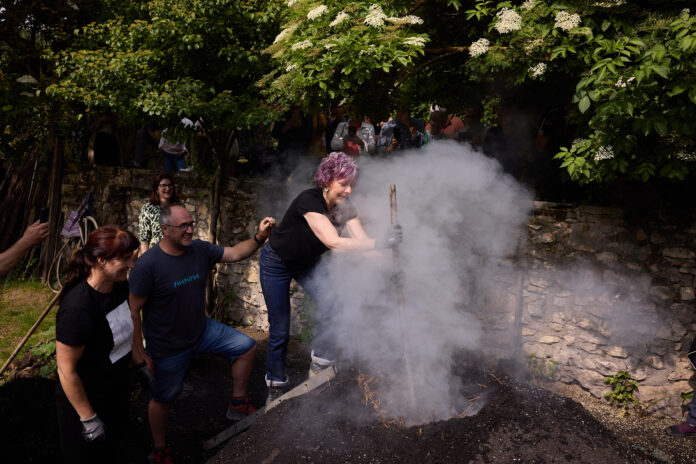 T* La consejera Rebeca Esnaola participa en una actividad de preparación y encendido de una carbonera del proyecto NAVARRA HUELLA POSITIVA, impulsado para reducir la huella de carbono en el turismo.