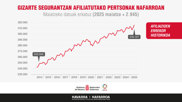 Nafarroak beste errekor bat lortu du, 316.137 pertsonek lan egin baitute. Gizarte Segurantzan maiatzean izandako afiliazioak Foru Komunitateak enplegua sortzen jarraitzen duela baieztatu du, apirilarekin alderatuta 2.945 afiliatu gehiago (% 0,94 gehiago) baititu; urteko hazkundeak, berriz, 4.874 afiliatu gehiago erregistratu ditu, hau da, %1,57ko igoera izan du.
