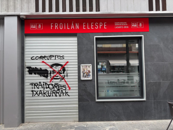 Esta mañana sede del PSE de Lasarte-Oria ha amanecido con pintadas contra Pedro Sánchez en su persiana exterior. Concretamente han dibujado la cara del presidente del Gobierno junto a las palabras «corruptos», «traidores» y «perros».