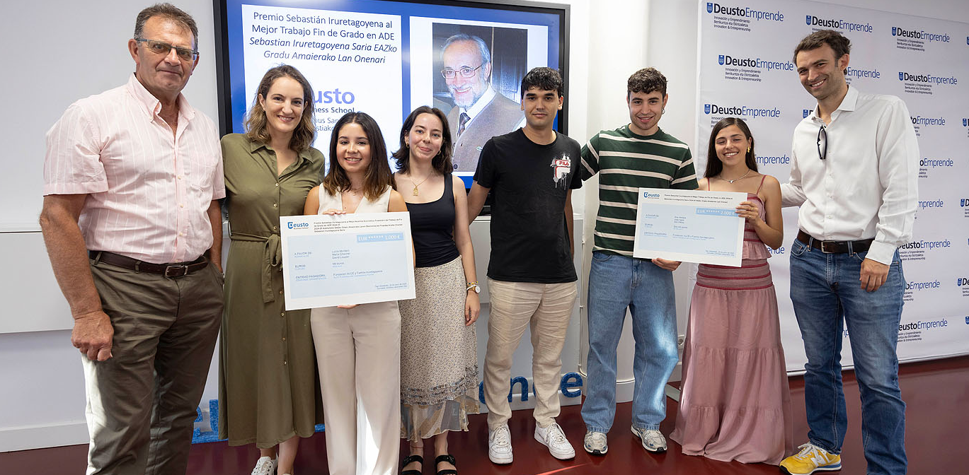 La Facultad de Ciencias Económicas y Empresariales-Deusto Business School en el campus de San Sebastián de la Universidad de Deusto ha entregado hoy el «Premio Sebastián Iruretagoyena al Mejor Trabajo Fin de Grado en ADE 2024-2025» al proyecto “Bideragarritasun azterketa: Soran Etxea berriro irekitzeko plana” elaborado por Ane Ibarbia Gárate, Josu Igoa Lopez de Aguileta e Iker Perez Gastañaga. El «Premio Sebastián Iruretagoyena al Trabajo Fin de Grado en ADE 2024-2025 con el Mejor Análisis Económico-Financiero» ha sido para el proyecto “FUNDACIÓN ARTIZARRA: Diseño de producto financiero dirigido a pymes destinado a proyectos empresariales” elaborado por Lucía Montero Muñoz, María Chavrier Cestero y David Louzán Francés.