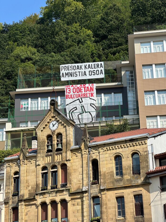 Asimismo, Covite ha denunciado la aparición de pancartas de apoyo a los presos de ETA en el recinto festivo de Bilbao. Concretamente ha criticado que la comparsa Txoribarrote haya desplegado una «enorme pancarta» pidiendo la excarcelación de los etarras: «Euskal preso eta iheslariak, etxera» (Los presos y huidos a casa).