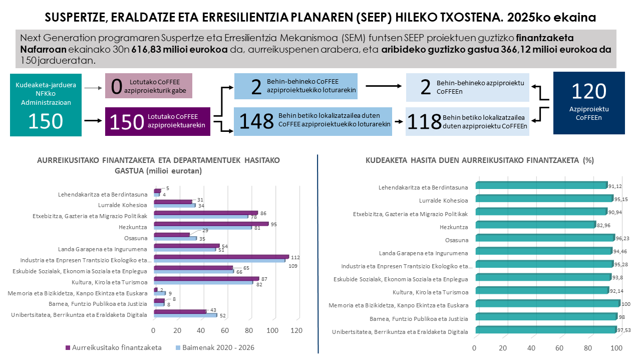 Nafarroa ekainaren amaierarairitsi zen 616,83 milioi euroko finantzaketarekin Berreskurapen, Eraldaketa eta Erresilientzia Planeko (PRTR) proiektuetarako, MRR funtsen bidez, Next Generation aldi baterako berreskurapenerako Europako aparteko tresna. Finantzaketa horretatik 614,71 milioi jaso eta kontabilizatu dira.