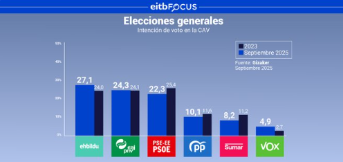 Si se convocaran ahora comicios generales, según la encuesta EITB Focus, Vox aumentaría su intención de voto en la Comunidad Autónoma Vasca. La representación de este partido supondría el 4,9% de las papeletas, subiendo más de dos puntos los apoyos que la formación obtuvo en 2023 (2,7%).