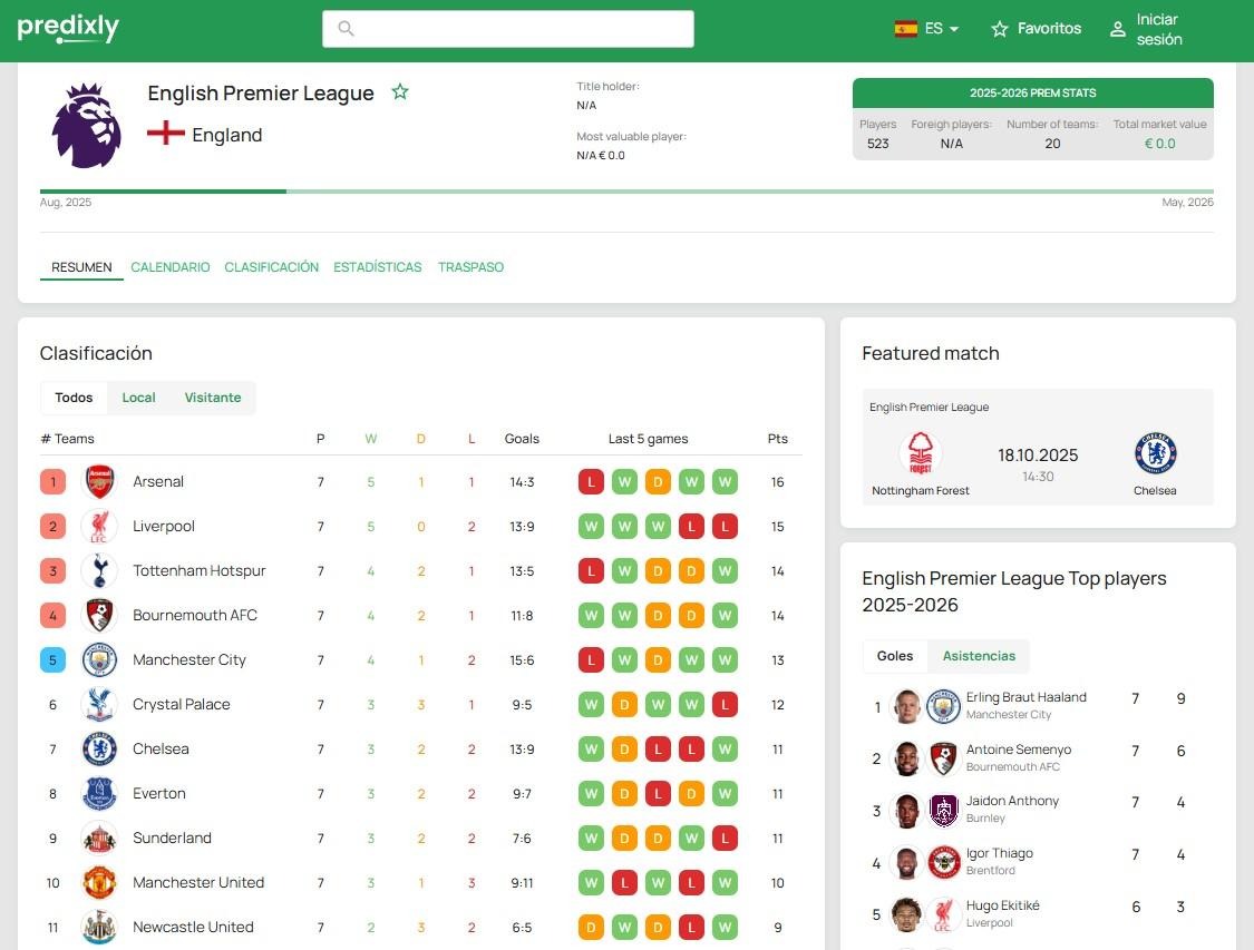 Sitios web como Predixly o el sitio oficial de la Premier League proporcionan la clasificación actual. Esta incluye victorias, empates, derrotas, diferencias de goles y puntos. Los usuarios pueden ordenar los resultados por forma reciente. Los códigos de colores marcan los últimos cinco resultados. El verde indica victorias, mientras que el rojo muestra derrotas. El patrón del Arsenal incluye cuatro victorias y un empate. Esto sugiere consistencia más que casualidad.