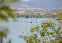 Vista del pantano de Alloz con escolares realizando prácticas de navegación en la Campaña Escolar de Vela 2021. Pantano de Alloz.