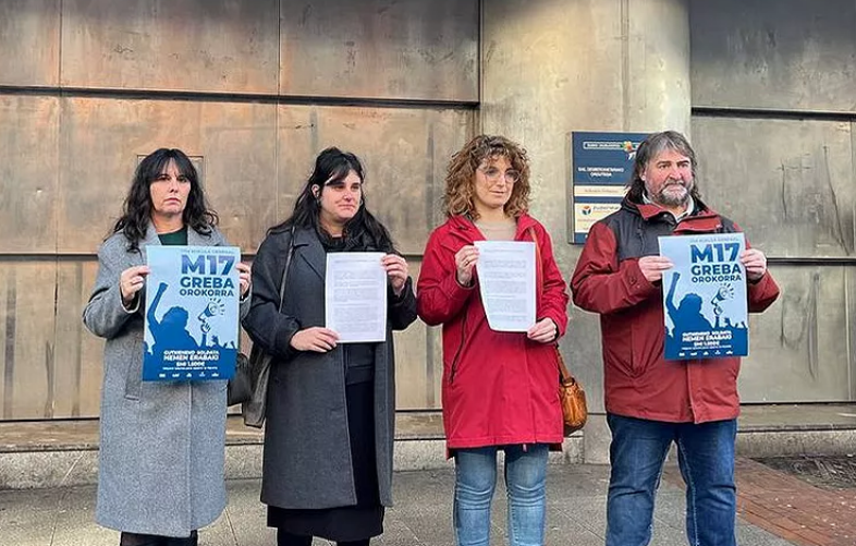 os sindicatos ELA, LAB, Steilas, Hiru y Etxalde han formalizado la convocatoria de una huelga general para el próximo 17 de marzo con el objetivo de impulsar un salario mínimo propio de 1.500 euros y mejorar el poder adquisitivo de la clase trabajadora.
