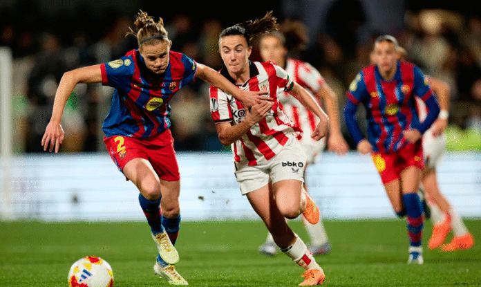 Javi Lergak partida luzea egin nahi izan du talde blaugranarentzat eta hasieran aurkariez ez dute abagunerik izan, Athletic txukun eta uzkur batekin. Hain zuzen ere, Maite Zubietaren zaldi bat izan zen arerioaren areara fedez heldu eta Mapik bota zuena, penaltia ekarri zuena. Nerea Nevadok egin zuen zigor handiena 24. minutuan. Barçak berehala erantzun du, eta 34. minutuan berdindu du, Ona Batllek aldaratze bat sartu eta gero, Alexiaren erremate luzearen ostean. Handik gutxira, korner batean, Irene Paredesek ere baliatu zuen irmotasun falta beste jokaldi nahasi batean. 2-1ekoarekin eta atsedenaldiaren atarian, Kika Nazareth kanporatu egin dute, Naia Landaluzeren sudurra hautsi duen ukondokada baten ondorioz.