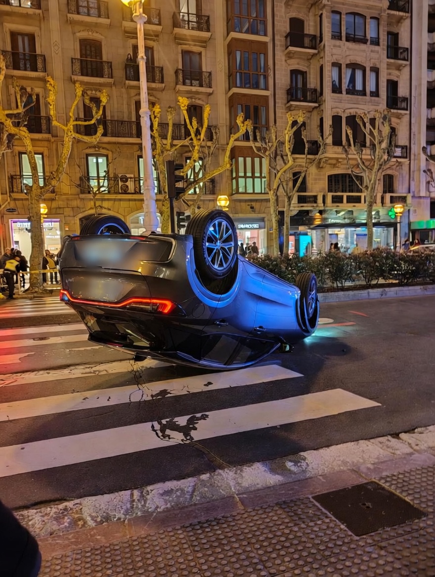 Un aparatoso accidente de tráfico ha alterado la circulación en el centro de San Sebastián durante la tarde de este martes. El siniestro se produjo minutos después de las 19:30 horas, cuando un turismo que circulaba por la Avenida de la Libertad, en dirección hacia el río Urumea, terminó volcado sobre la calzada por causas que todavía se están investigando. El vehículo quedó en mitad de la vía, obligando a intervenir de urgencia a los servicios de emergencia en una de las arterias principales de la ciudad.